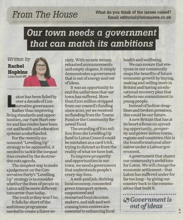 Latest Luton News Article – How the Levelling Up White Paper fails our town